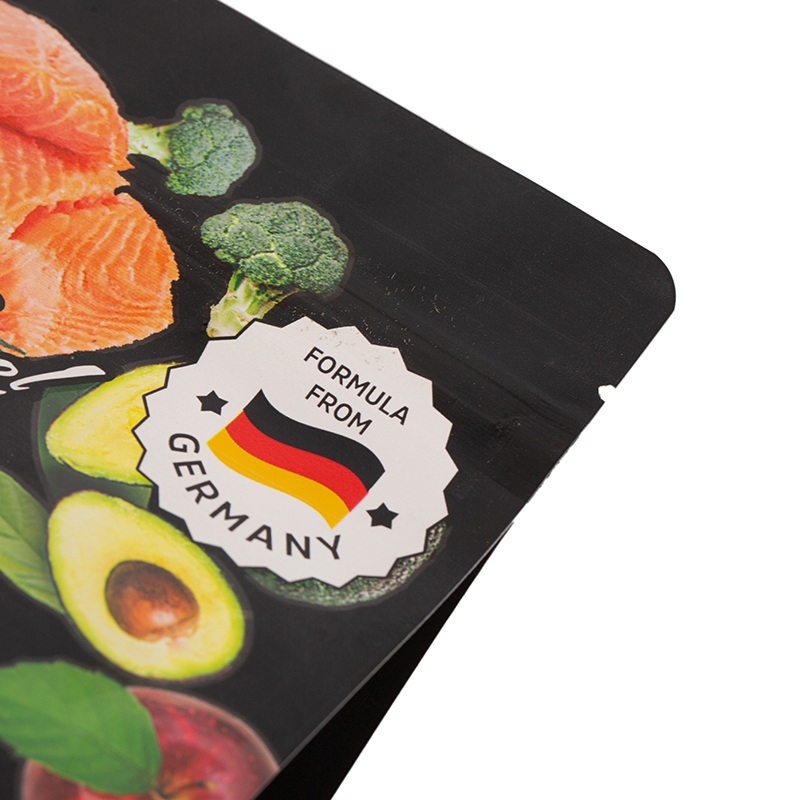 Lorsque vous remplissez la nourriture pour chien, il n'est pas nécessaire de la remplir trop. Laissez un peu d'espace pour que la fermeture éclair se ferme, avant de sceller le sac, vous pouvez presser doucement le corps du sac pour expulser l'air à l'intérieur, de cette façon, l'effet d'étanchéité sera meilleur et la nourriture pour chien pourra être conservée plus longtemps.